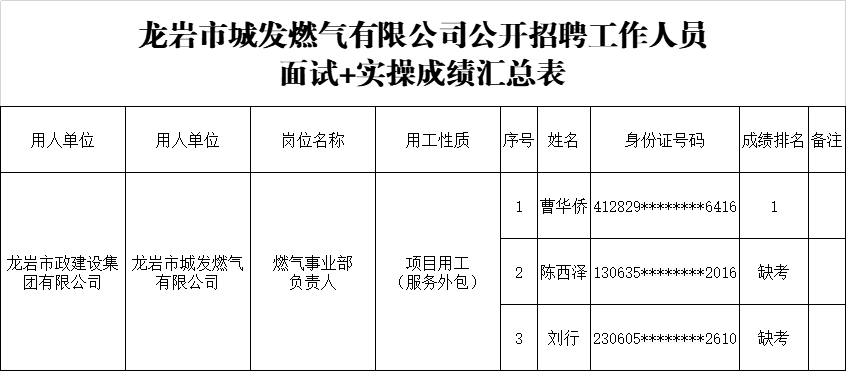 根據2025年421日發布的《龍巖市政建設集團有限公司關于公開招聘工作人員的公告》有關要求,現將龍巖市城發燃氣有限公司燃氣事業部負責人崗位“面試+實操”成績排名予以公示。