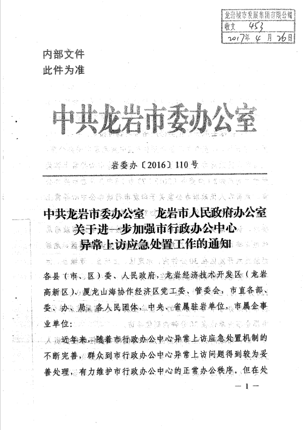 市委辦關于進一步加強市行政辦公中心異常上訪應急處置工作的通知(巖委辦【2017】110號)