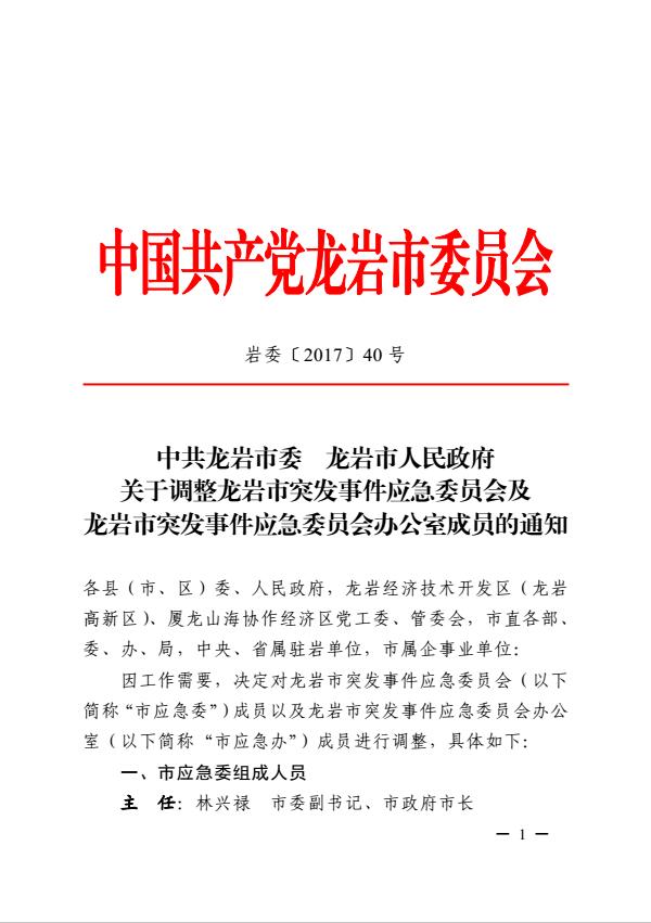 市委關于調整龍巖市突發事件應急委員會及龍巖市突發事件應急委員會辦公室成員的通知(巖委【2017】40號)