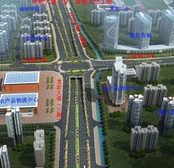 龍巖大道工業路下穿通道項目位于龍巖大道與工業路交叉口,為現狀龍巖大道三期道路上設置下穿通道,起始于規劃支路農產品物流配送中心路口,終止于龍巖大道四期龍巖第一技師學院東側,全長383米,其中框架涵長度80米,U型槽長度303米,地道凈寬2×13米,雙向六車道。主通道兩側設置兩道南北向人行地下通道,人行通道斷面型式:5×3.5米,主通道長124米,梯道長128米,總投資約2億元。