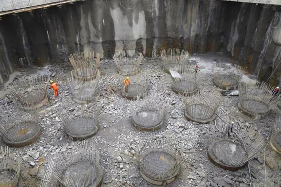 8月24日,繼龍巖大道高架橋主橋主塔樁基、承臺基坑開挖完成后項目已進入主塔承臺施工階段主橋封底混凝土澆筑完成0.75米(共1.5米)主橋轉體關鍵設備鑄鋼球鉸已生產完成現場正進行樁頭破除作業。由于連續橫跨贛龍鐵路、龍廈鐵路、羅龍東路、龍津河、雙洋路,主橋采用不對稱跨塔梁同時轉體施工,其轉體總重達2.366萬噸,轉體懸臂173.75m,施工難度巨大。為避免對城市道路及鐵路運行的影響,主橋將采用不對稱跨塔梁施工并分二次轉體,下一步進行控制性工程為兩次主塔轉體施工。