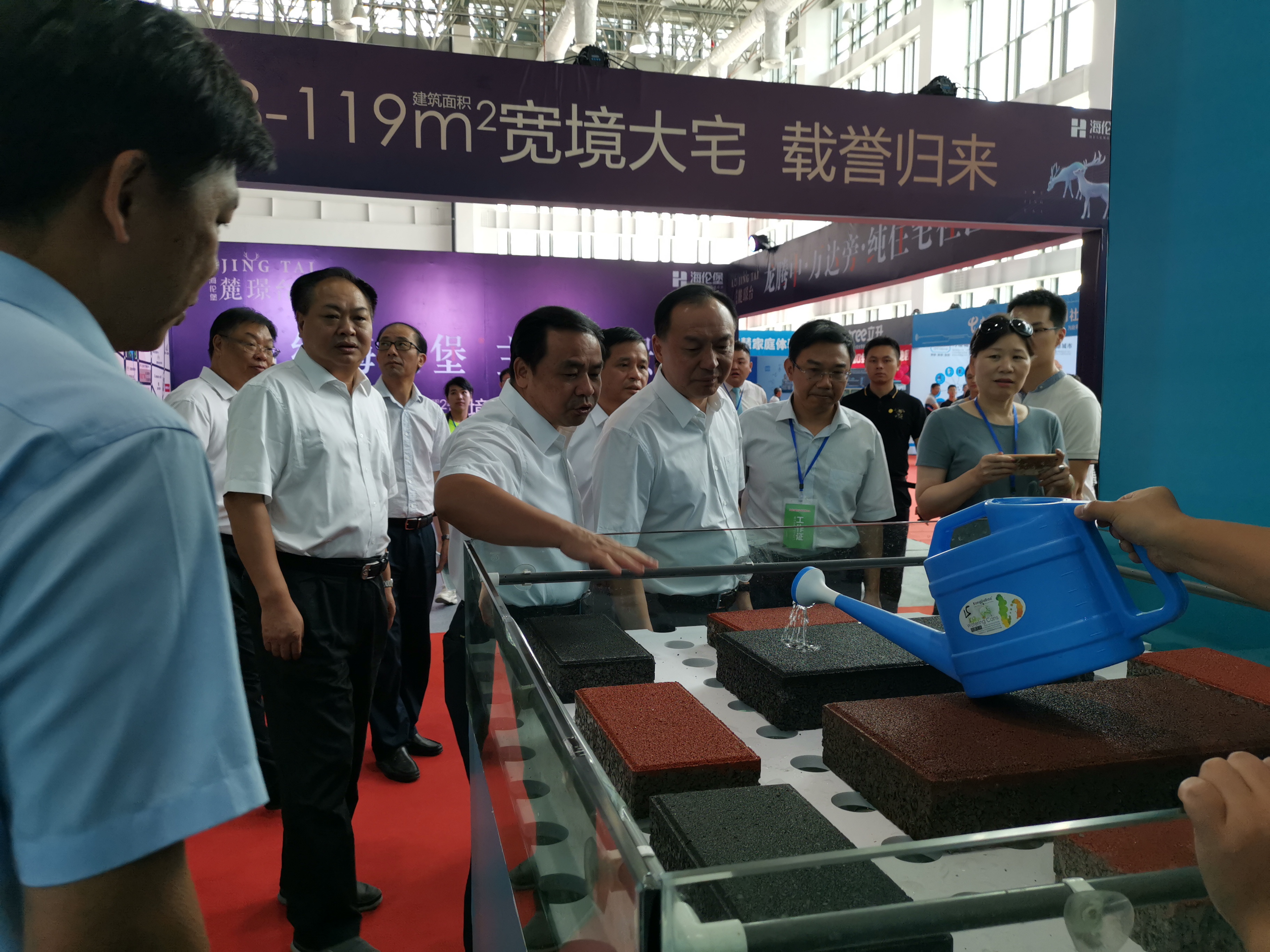8月16日—18日,龍巖天潤龍城新型建材有限公司參加龍巖市建筑產業發展大會建筑新型材料展,展會上公司發放了公司產品宣傳冊,播放公司產品宣傳片,擺放公司產品樣品并在現場進行透水效果演示,市委許維澤書記一行在巡視展館中饒有興致地觀看聽取了公司產品性能情況介紹,對透水建材產品贊譽有加