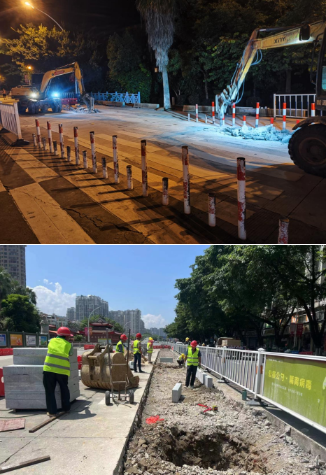 小溪路口地處老城區、蓮東片區、新城區交界處,群眾反映該路口交通標識不清、行人過街不便等,存在安全隱患,為此,市委、市政府及市住建局等相關部門高度重視,決定由市政集團所屬企業市城投公司對該路段實施提升改造,重點實施道路白改黑、雨污分流改造、綠化提升、道路標識完善、交通安全設施提升等建設,項目總投資約3500萬元。工程于7月下旬開工建設,目前正在進行混凝土病害處理、雨水管網開挖鋪設、路沿石安裝及各管線遷改等施工作業。